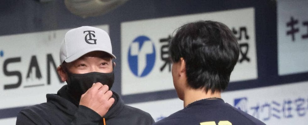 【写真】オリックス対巨人 試合前、オリックス広岡のあいさつを受け、笑顔で話す巨人阿部監督(撮影・西尾就之)