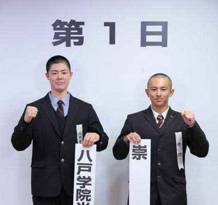 対戦が決まり健闘を誓う八戸学院光星の北口晃大主将(左)と崇徳の新村瑠聖主将=2026年3月6日午前10時13分、大阪市北区、代表撮影