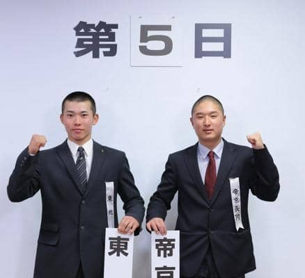 対戦が決まり健闘を誓う東北の松本叶大主将(左)と帝京長岡の鈴木祥大主将=2026年3月6日午前10時33分、大阪市北区、代表撮影