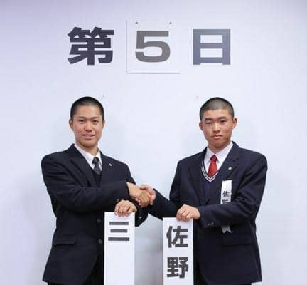 対戦が決まり健闘を誓う三重の大西新史主将(左)と佐野日大の中村盛汰主将=2026年3月6日午前10時44分、大阪市北区、代表撮影