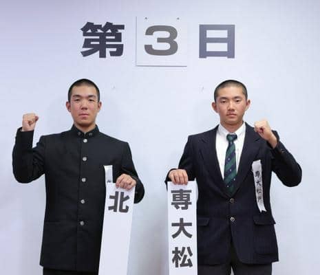 対戦が決まり健闘を誓う北照の手代森煌斗主将(左)と専大松戸の高貝規仁主将=2026年3月6日午前10時28分、大阪市北区、代表撮影