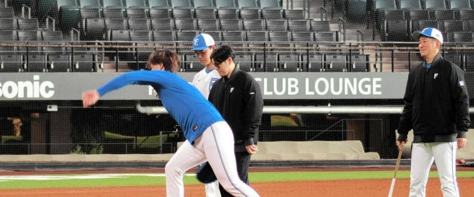 日本ハム・山崎福也投手(33)が6日、エスコンフィールドでの投手練習に参加し、加藤投手コーチとフォームの確認に取り組ん…