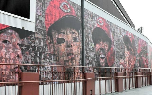 広島カープは6日、マツダスタジアム近くにある屋内練習場の壁画をリニューアルし、報道陣に向けてお披露目会を開いた。歩道「…