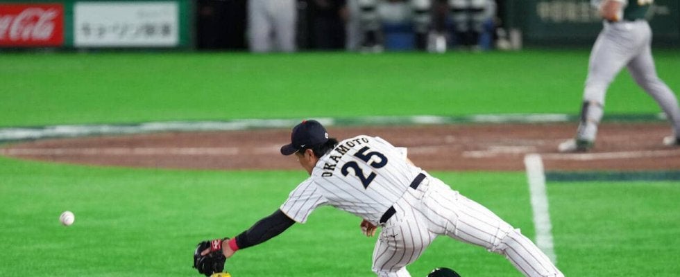 【写真】日本対オーストラリア 6回表オーストラリア1死二塁、捕手若月の三塁悪送球でA・ホワイトフィールド(下)の三塁盗塁、先制の生還を許す。三塁手岡本(撮影・足立雅史)