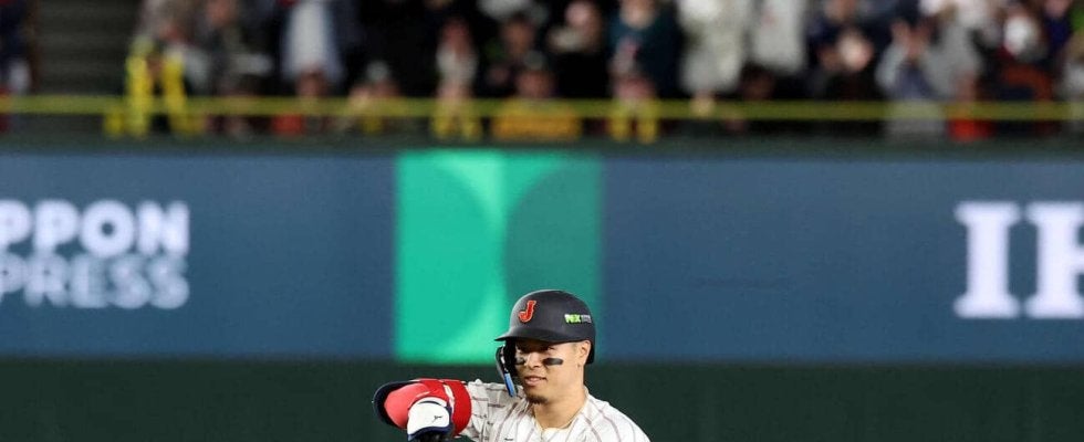 【WBC】代打の佐藤輝明が貴重な適時二塁打!お茶たてポーズも 天覧試合で大会初安打&初打点 | 野球