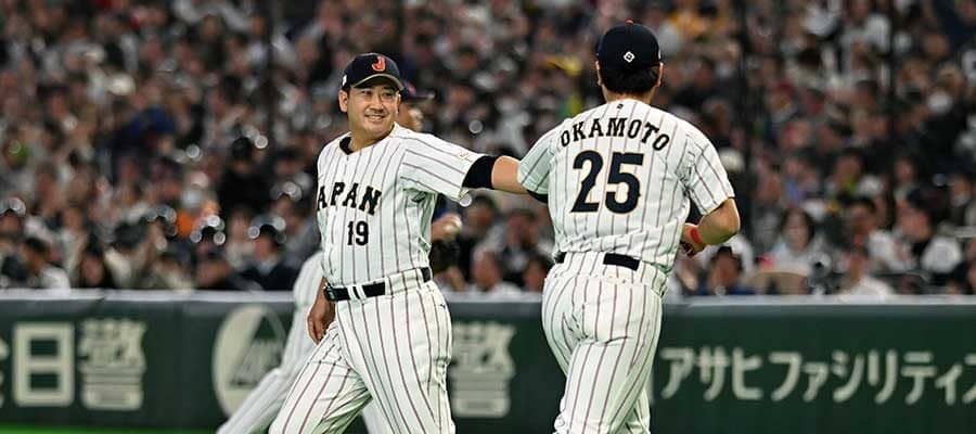 豪州戦に先発した侍ジャパン・菅野智之(左)と岡本和真【写真:Getty Images】