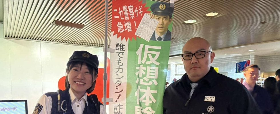【写真】大阪府警によるニセ警察詐欺の仮想体験をした荒磯親方(右)