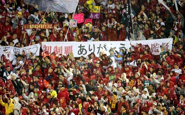横断幕を掲げ、日本一を喜ぶ楽天ファンら=2013年11月3日、仙台市宮城野区のKスタ宮城(現楽天モバイル 最強パーク宮城)、飯塚晋一撮影