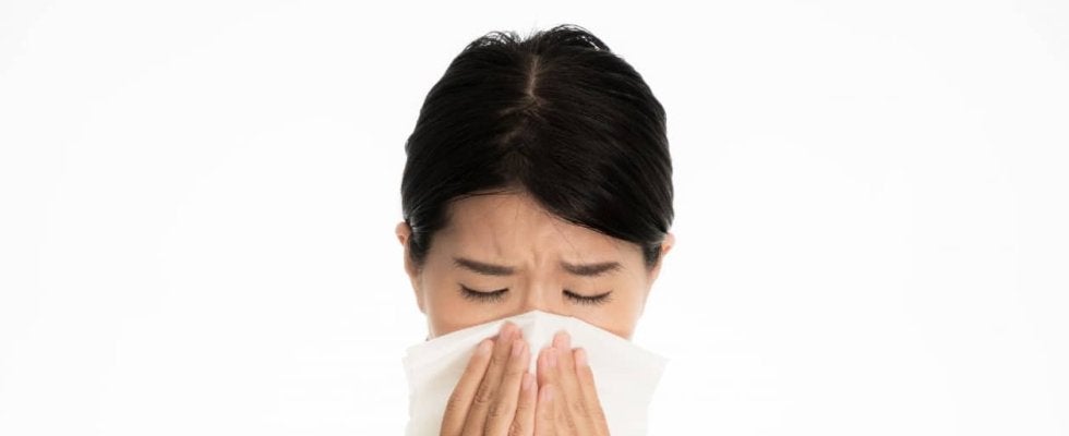 ティッシュで鼻をかみながら病状に悩む女性