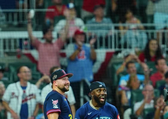 【写真】25年のオールスターゲーム ホームランダービーの決勝戦で柵越えを連発し笑顔を見せるローリー(左)とアロザレーナ