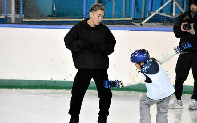 滑り方を指導する高橋大輔さん(左)=2026年3月8日午後2時20分、松山市、宮沢崇志撮影