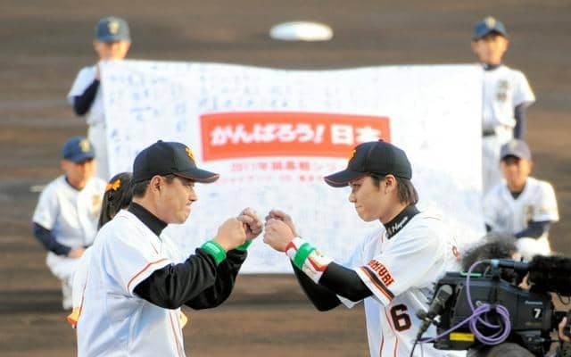 巨人の選手たちの左袖には黒い輪がデザインされていた。原辰徳監督(左)とこぶしを合わせる坂本勇人選手=2011年4月12日午後5時50分、山口県宇部市のユーピーアールスタジアム