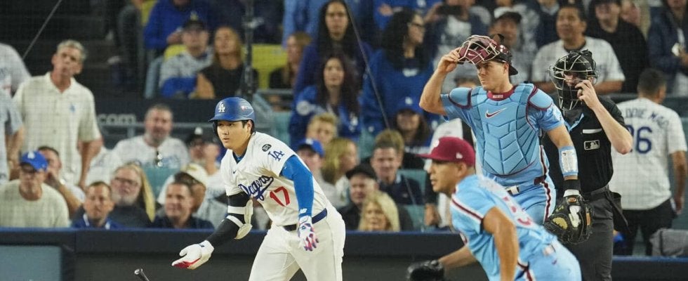 【写真】25年10月、地区シリーズ・ドジャース対フィリーズで一ゴロに倒れる大谷。投手スアレス
