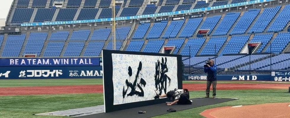 【写真】DeNA必勝祈願の後に書道パフォーマンスを行う書道家の杉田曠機氏