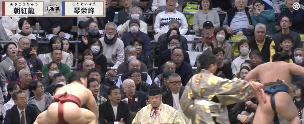 力士も思わず「おっ!みたいな表情」で驚く 約1分30秒協議→“同体取り直し”に「体が飛んでた」「かかと出てたよ」館内もどよめく | ABEMA
