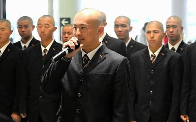 決意表明をする崇徳の新村瑠聖主将=2026年3月13日午前10時24分、JR広島駅、相川智撮影