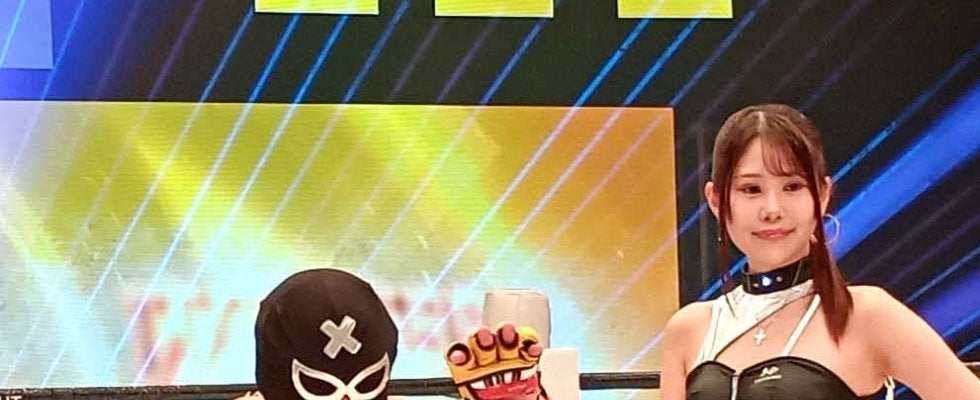 【写真】快勝した戦闘員1号。試合はマスクを脱いで行います。素顔が見たい方は会場へ(右はKNOCK OUTガールズの神楽坂茜)