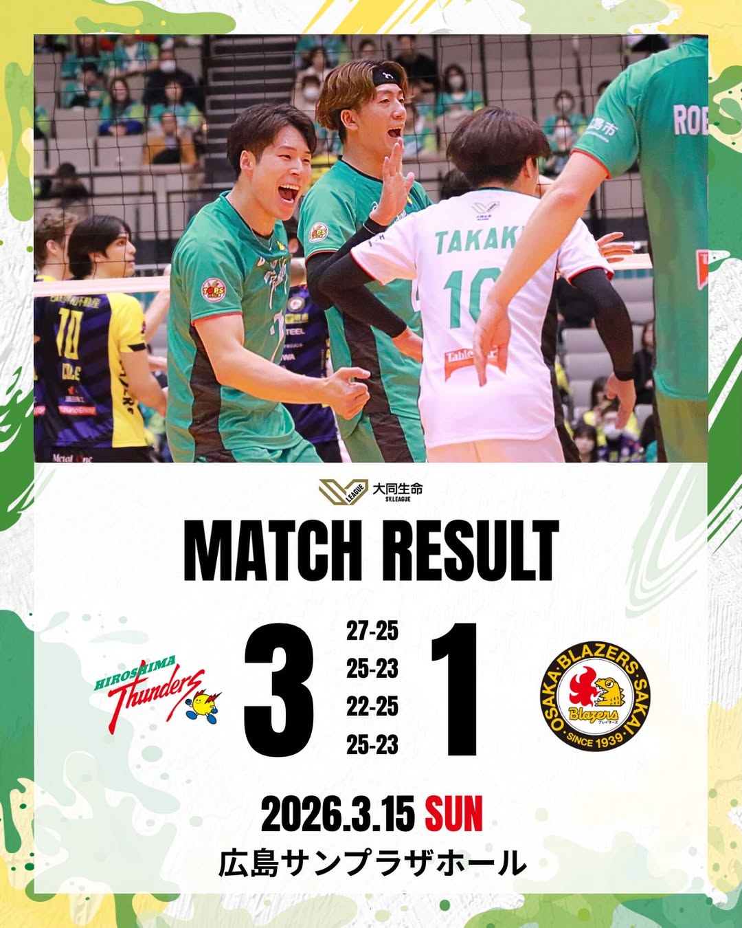 1勝1敗の痛み分け。大同生命SVリーグ男子の第17節・広島サンダーズ対日本製鉄堺ブレイザーズが3月14日・15日、広島サ…