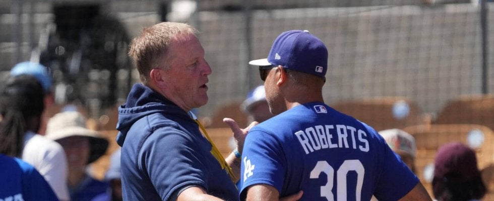 【写真】試合前にブルワーズのマーフィー監督(左)と話すドジャースのロバーツ監督(ロイター)
