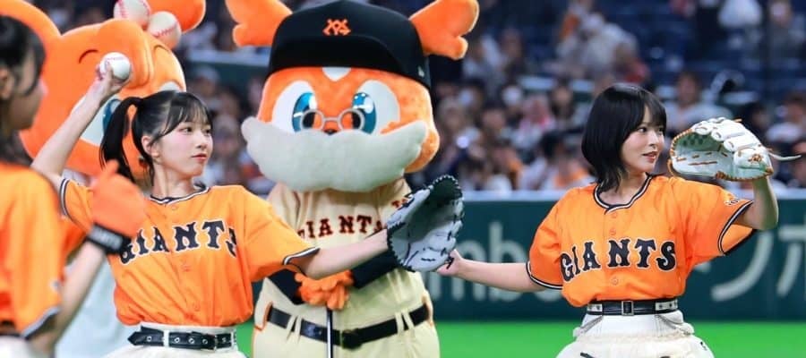 巨人ユニホームとひらひらスカートで登場、豪快な足上げからノーバウンド投球 人気アイドルグループ「≒JOY(ニアリーイコー…