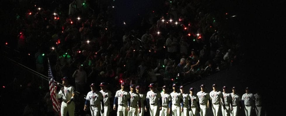【写真】暗転する決勝のグラウンドに入場した米国チーム(AP)