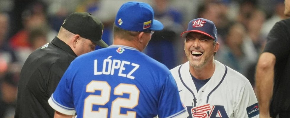 【写真】決勝のプレーボール直前、会話を交わすベネズエラのロペス監督と米国のデローサ監督(右、AP)