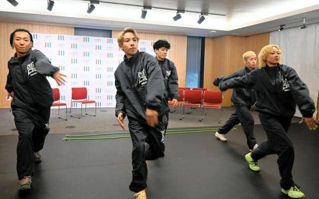 パフォーマンスを披露する「RECK」のメンバーたち=川崎市役所
