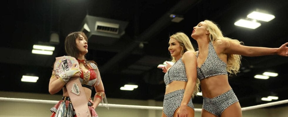 【写真】ジ・インスピレーションの2人(右がキャシー、左がジェシー)から挑発される上原わかな(C)東京女子プロレス
