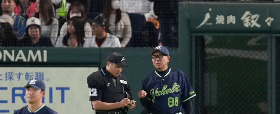 【写真】巨人対ヤクルト メンバー交代を告げるヤクルト池山監督(撮影・増田悦実)