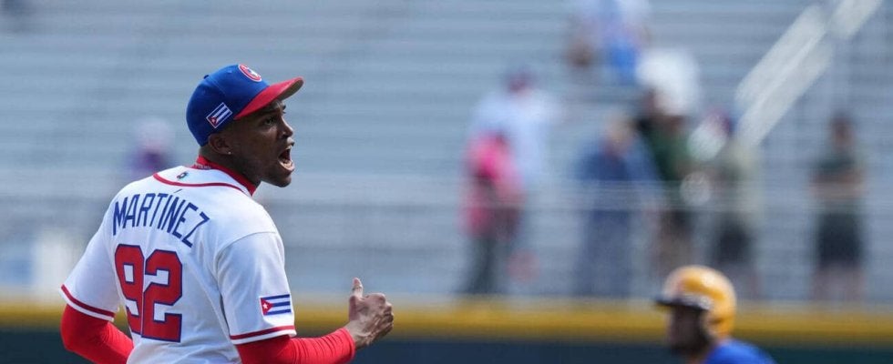 【写真】8日、WBCコロンビア戦の9回を締め、ガッツポーズを繰り出すキューバのライデル・マルティネス(AP)