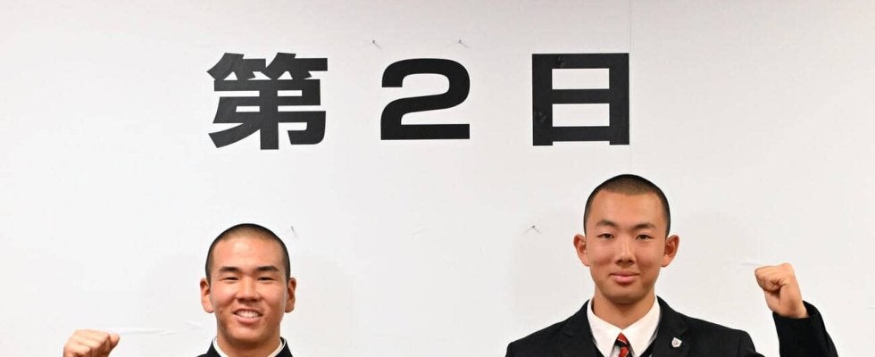 【写真】健闘を誓う横浜の小野舜友主将(左)と神村学園の梶山侑孜主将(2026年3月6日撮影)