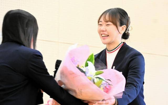 スケート部の後輩から花束を受け取る吉田雪乃選手=2026年3月19日、盛岡市、佐藤善一撮影