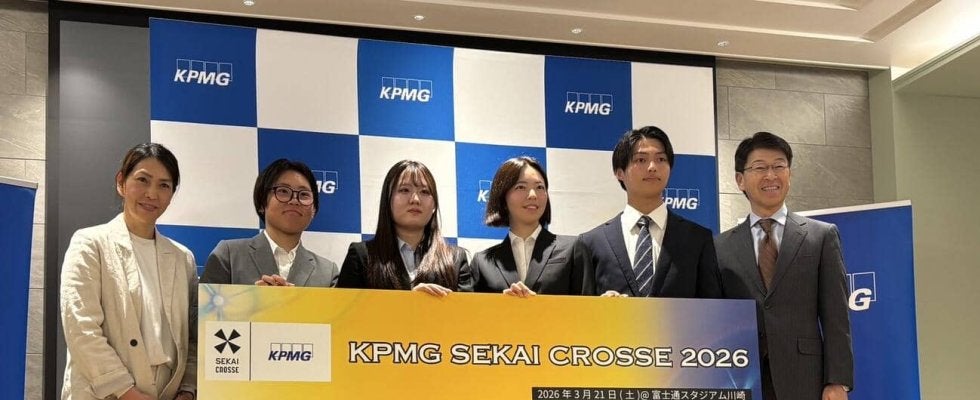 【写真】「KPMG SEKAI CROSSE 2026」の記者会見で笑顔を見せる大会代表の山田幸代氏(左)、KPMGジャパンの岡田光COO(右)、実行委員会の大学生ら