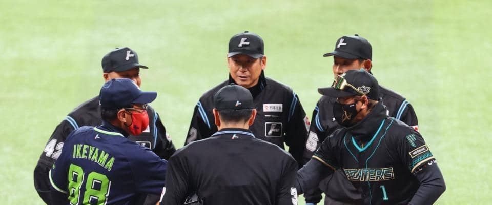 「オープン戦、日本ハム-ヤクルト」(20日、エスコンフィールド) 試合前のメンバー表交換で、ヤクルトの池山隆寛監督が赤…