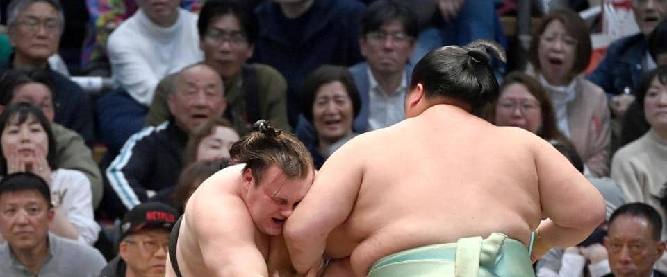 大関安青錦が負け越し危機 大栄翔に突き倒されて7敗目 綱とり場所でまさかの事態に やや足引きずり、視線落とし引き上げる