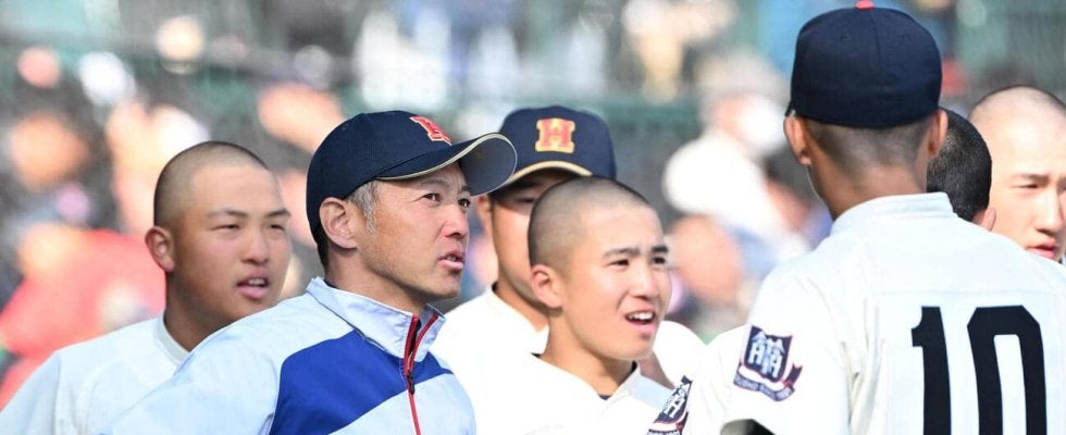 【写真】専大松戸対北照 ナインに声をかける北照の上林弘樹監督(左から2人目)(撮影・石井愛子)