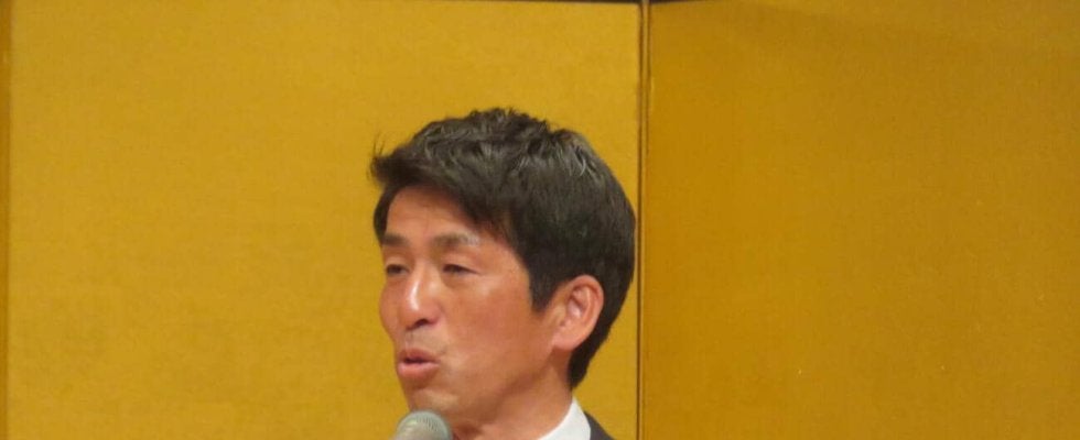 【写真】筑波大学蹴球部の第74回全日本大学サッカー選手権大会祝勝会兼創部130周年記念パーティーに出席した同部の小井土正亮監督(撮影・佐藤成)