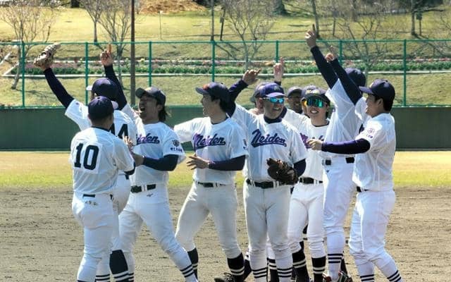 マスターズ甲子園愛知大会で初優勝し、喜ぶ愛工大名電OB=2026年3月21日、愛知県田原市、辻健治撮影