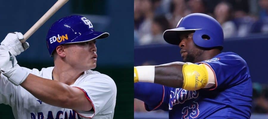 中日・細川成也(左)とミゲル・サノー【写真:加治屋友輝】