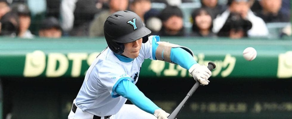 【写真】山梨学院対長崎日大 1回表山梨学院1死二、三塁、光永は投前へスクイズを決める(撮影・岩下翔太)