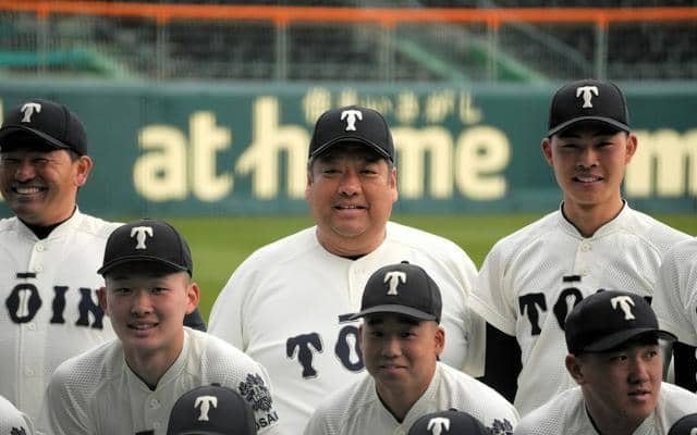 選手やスタッフと一緒に記念撮影する大阪桐蔭の西谷浩一監督(後列中央)=2026年3月14日午後4時20分、阪神甲子園球場、室田賢撮影
