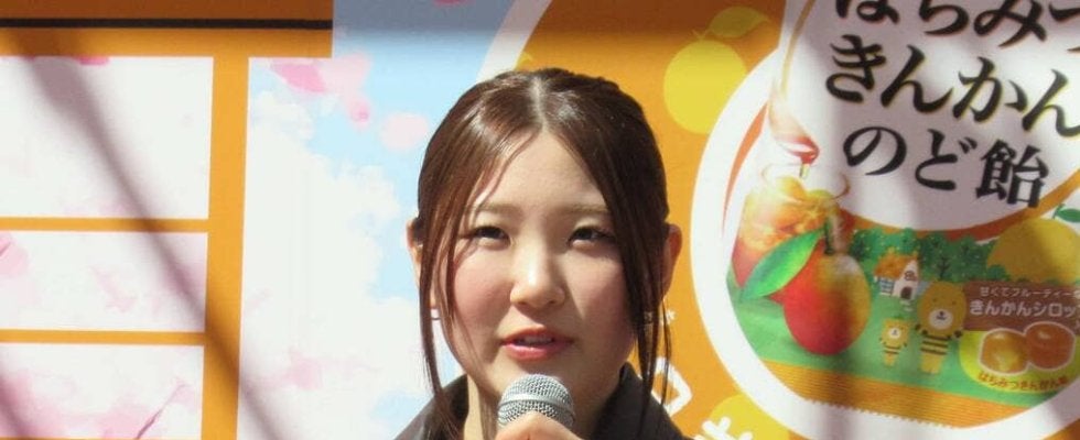 「はちみつきんかんのど飴」のはちきん神社PRイベントに登壇し、4月から始まる新社会人生活に向けて意気込んだ小野光希(カメラ・宮下京香)