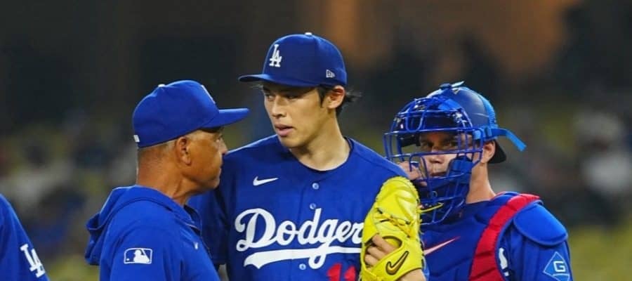 降板を告げられたドジャース・佐々木朗希(中央)【写真:荒川祐史】