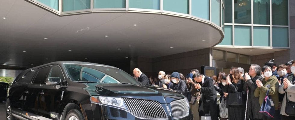 出棺する元大関・若嶋津を乗せた霊柩車(カメラ・古川 剛伊)