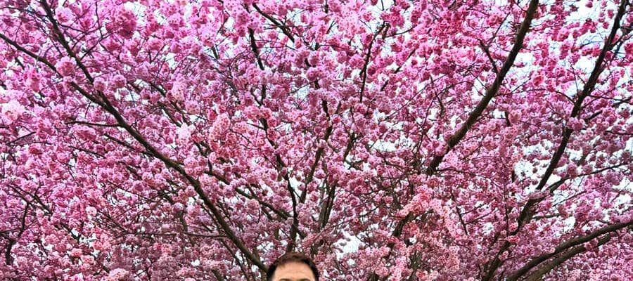満開の桜をバックに撮影に応じたドイツ6部バサラマインツの岡崎慎司監督