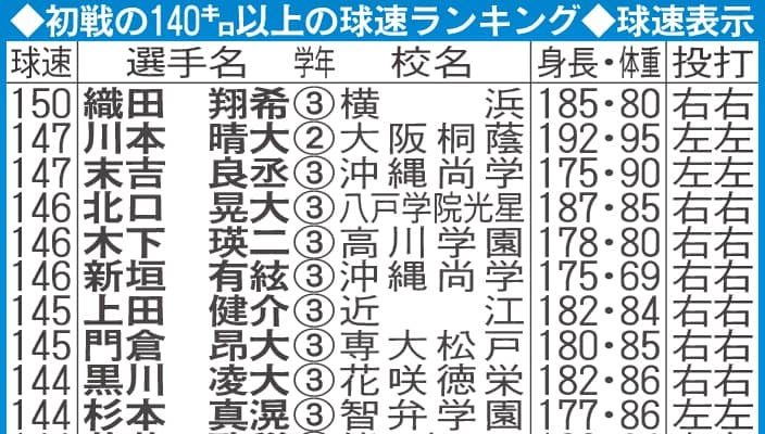 【センバツ】初戦の140キロ以上の球速ランキング/一覧 | 野球