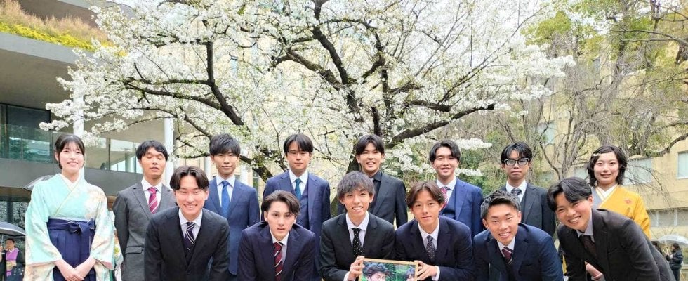 青学大の卒業式に臨んだ駅伝チーム。昨年2月に亡くなった同期の皆渡星七さんの写真を黒田朝日(前列左から3人目)と塩出翔太(同4人目)が大切に掲げた
