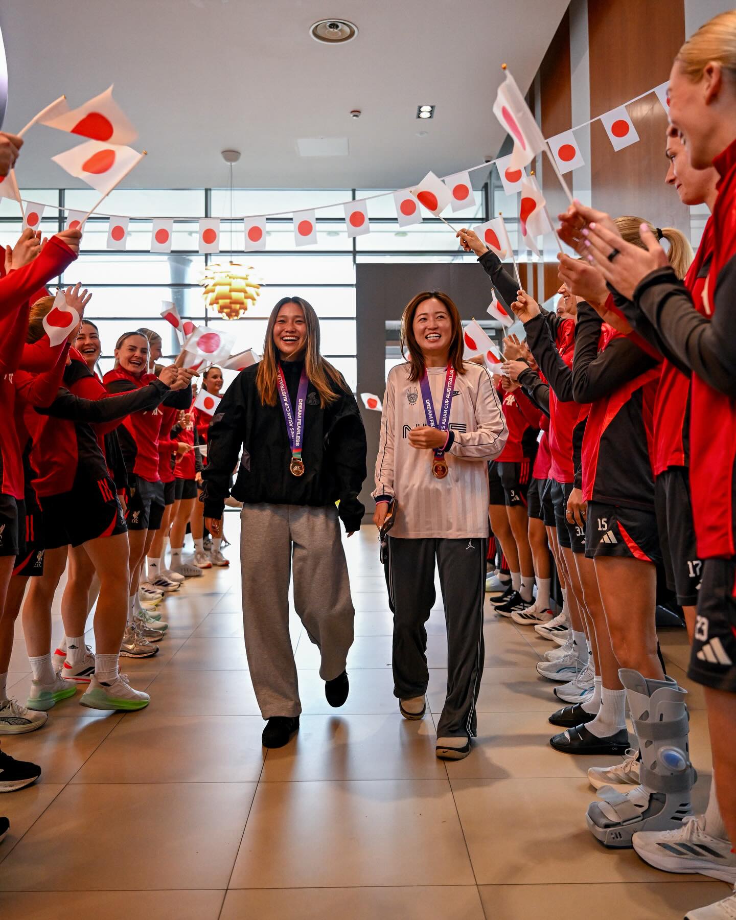 【なでしこ】長野風花がアジア杯優勝メダルでリバプールへ凱旋 チームメートが日本国旗で出迎え