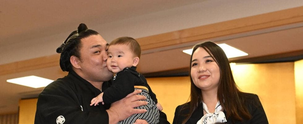 【写真】大関昇進を受けた霧島はホラン夫人(右)ら家族と記念撮影する(撮影・和賀正仁)