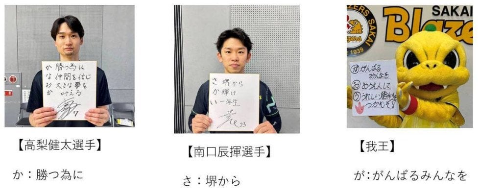 あいうえお作文でホーム戦へ意気込みを語った(左から)高梨健太、南口辰揮(提供写真)